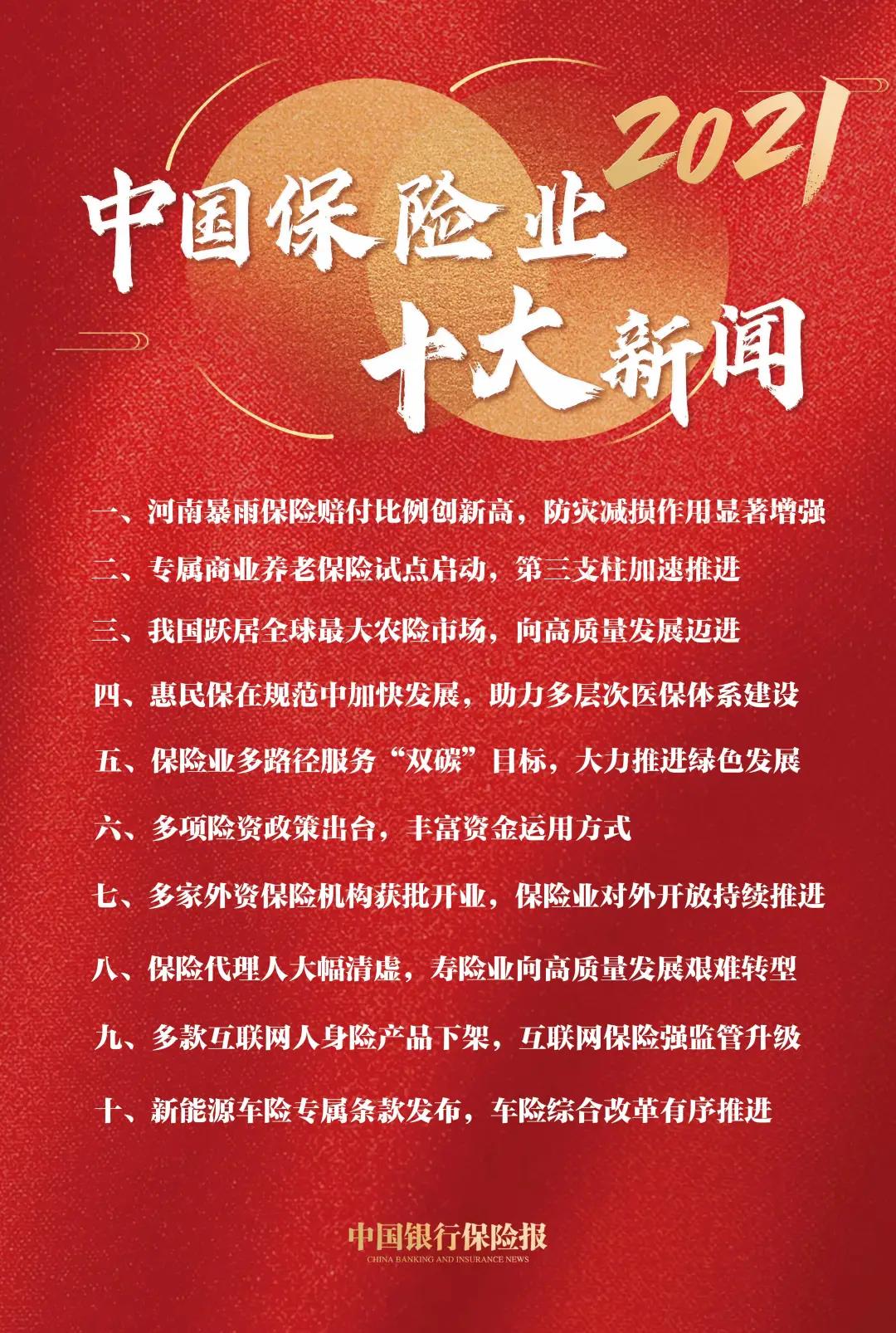 12月31日,由《中国银行保险报》评选的2021年中国保险业十大新闻正式出炉。中国银行保险报是银保监会主管的唯一报纸,十大新闻由业界专家学者投票评选,反映了“十四五”开局之年保险行业的重大动态。
